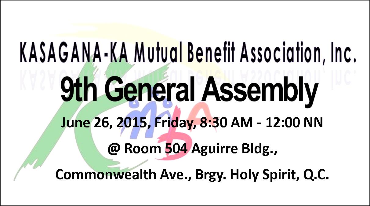 Please be informed that the 9th Annual General Assembly of Kasagana-ka Mutual Benefit Association, Inc. (KMBA) shall be held on June 26, 2015, Friday, 8:30 AM - 12:00 NN at Room 504 Aguirre Bldg., Commonwealth Ave., Barangay Holy Spirit, Quezon City.