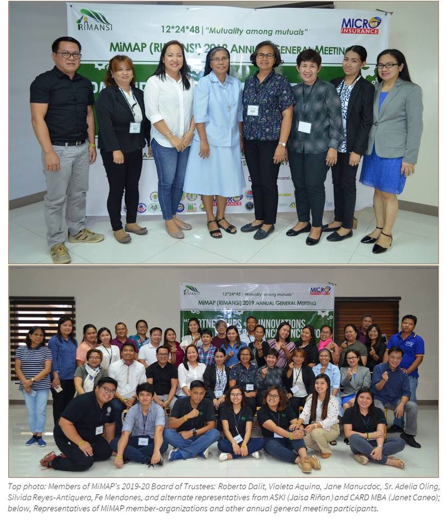 KMBA General Manager Silvida Reyes-Antiquera was elected Year 2019-20 President of the Board of Trustees of the RIMANSI Mi-MBA Association of the Philippines (MiMAP) during its Annual General Meeting held on 22 March 2019 in Tanay Rizal. Also elected to the Board were May Dawat (CARD, Inc.), vice president; Adelia Oling (PALFSI), secretary; and Emeteria Quijano (ASKI MBA), treasurer. The other members of the Board are Violeta Aquino, Roberto Dalit, Pelagia Mendones, Elena Velasco, Camilo Casals, Wilfredo Llanto, and Epifanio Maniebo; and Jaime Aristotle Alip of CARD, MiMAP’s Board Chairman Emeritus.