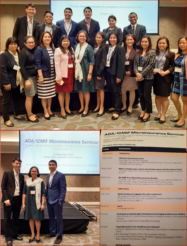 KASAGANA-KA Mutual Benefit Association attended the AOA-ICMIF microinsurance seminar held in Auckland, New Zealand, on 11 November 2019. KMBA is a member of AOA or the Asia and Oceania Association, a regional grouping of the ICMIF (the International Cooperative and Mutual Insurance Federation). The microinsurance seminar was held as a preliminary activity to the ICMIF Biennial Conference, which will be held from 12 November to 15 November 2019, also in Auckland.