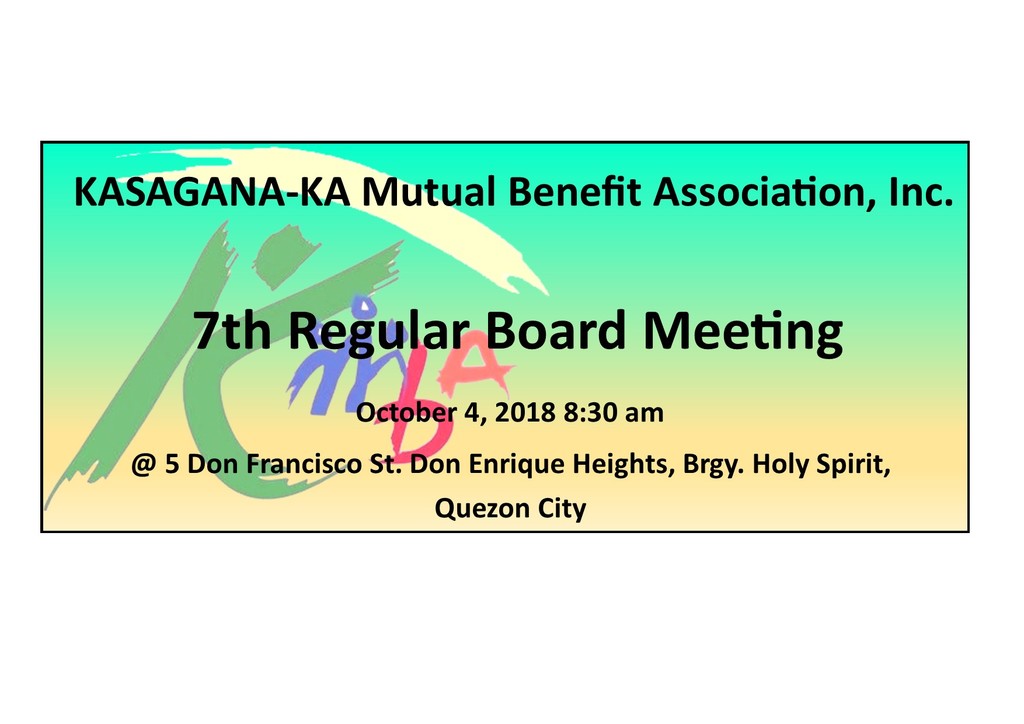 KMBA is inviting you to attend the upcoming board meeting on October 4, 2018 8:30 in the morning to be held at KDCI Conference room with office address at 5 Don Francisco St. Don Enrique Heights, Bgy. Holy Spirit Quezon City to discuss the following matters.