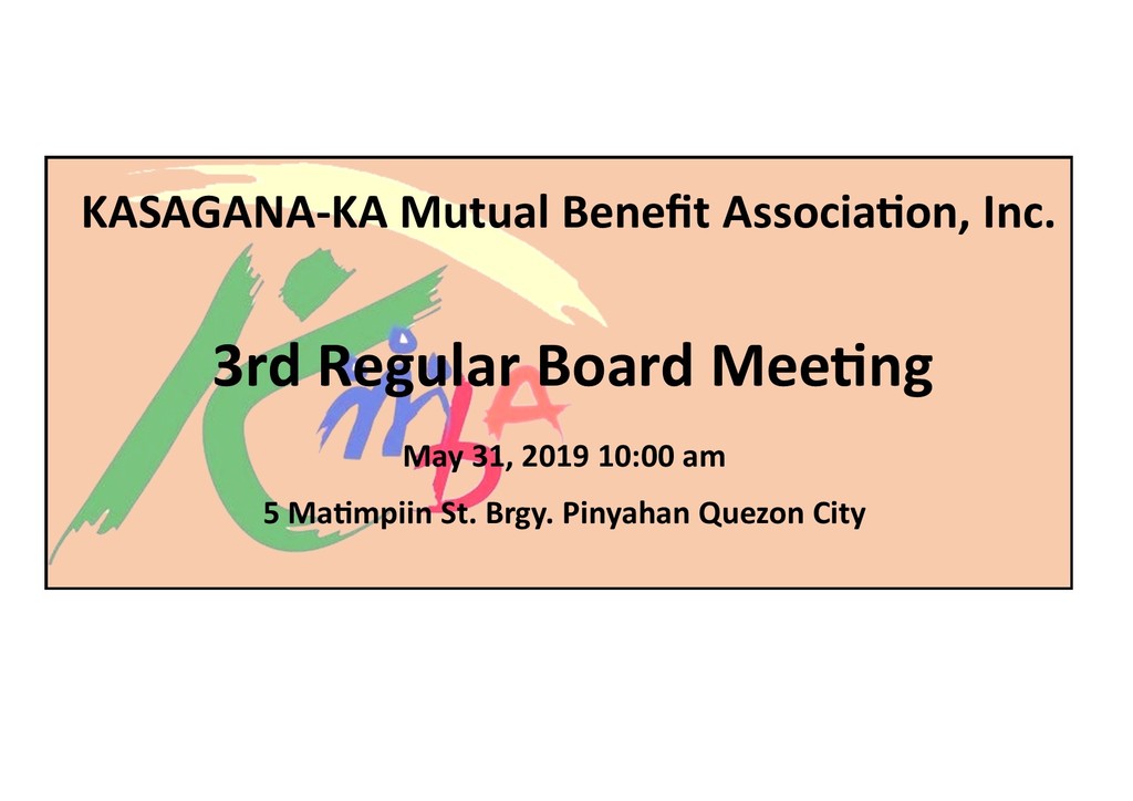 This is to infom you that KMBA will be having its Third Regular Board Meeting on May 31, 2019, 10:00 in the morning, right after the mass at KMBA New Building located at 5 Matimpiin St. Brgy. Pinyahan Quezon City. Everyone is invited to attend the meeting to discuss the following agenda.
