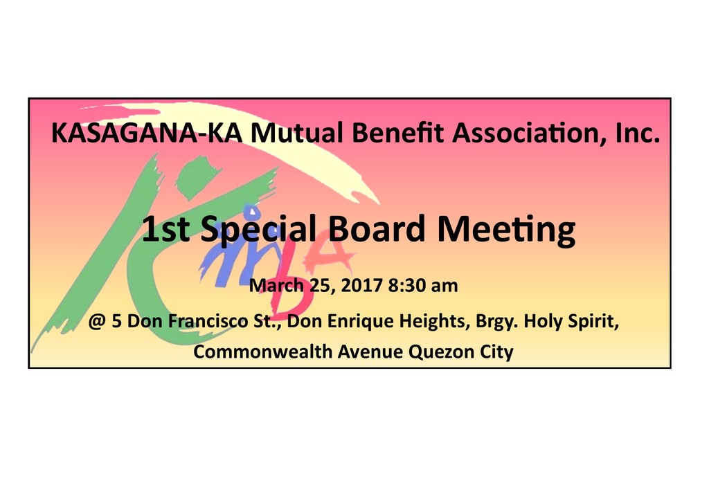 Please be informed that KMBA will have its Special Meeting on March 25, 2017, 8: 30 am at DEHHA Clubhouse, Don Enrique Heights, Holy Spirit Quezon City to discuss the following matters.