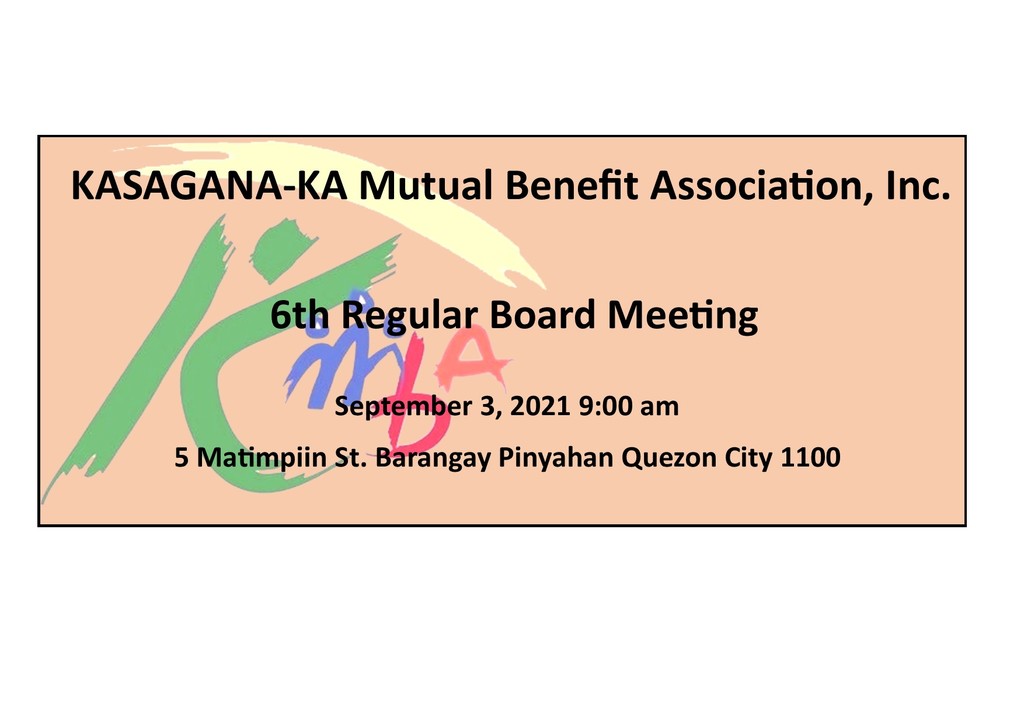 This is to inform you that our 5th Regular Board Meeting is set on September 3, 2021 at 9:00 in the morning via zoom to discuss the following agenda.
