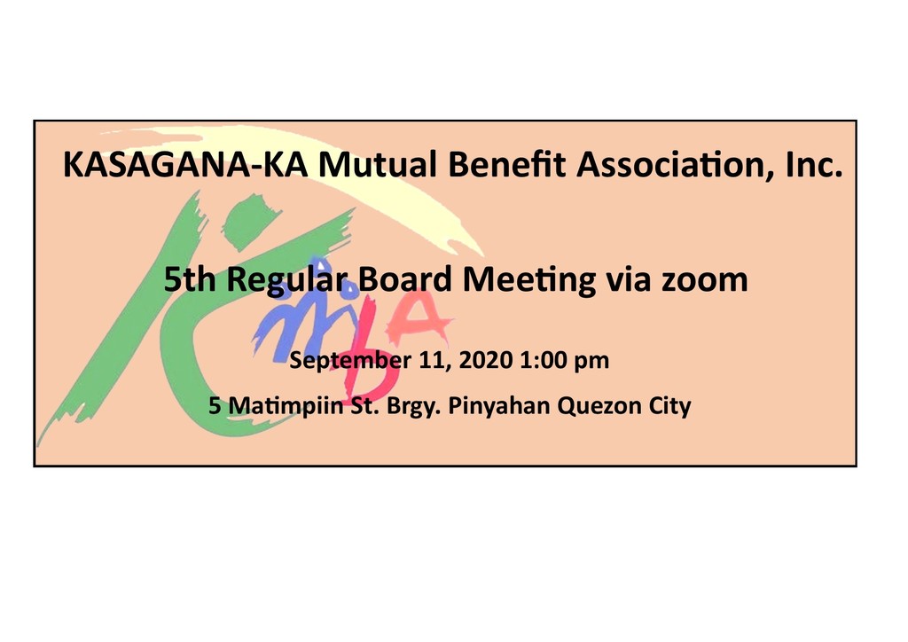 KMBA is inviting you to attend our 5th Regular Board Meeting on September 11, 2020, 1:00 pm via zoom videoconferencing to discuss the following agenda.